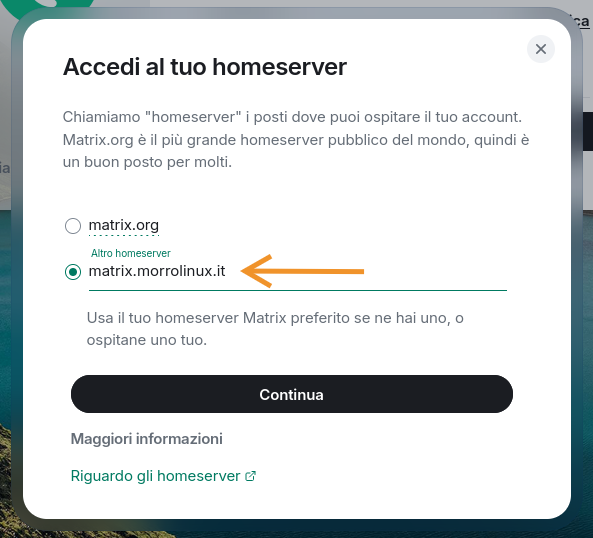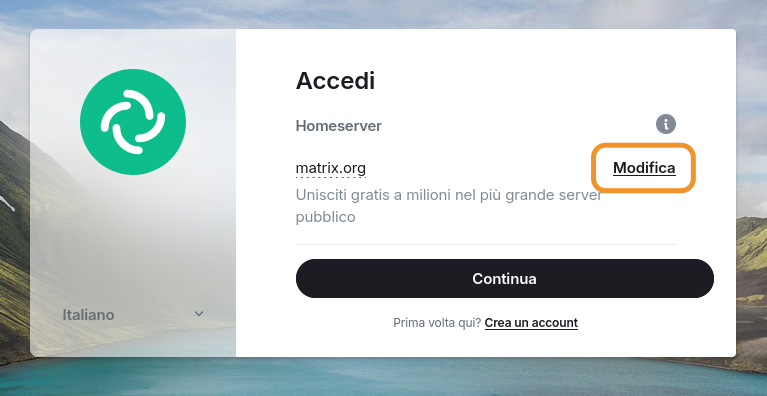 Visita app.element.io e premi Modifica per fare l'accesso con un Homeserver differente: